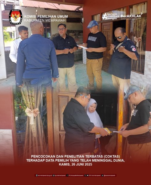 KPUMempawah-Komisi Pemilihan Umum (KPU) Kabupaten Mempawah, didampingi Badan Pengawas Pemilu (Bawaslu) Kabupaten Mempawah, melaksanakan kegiatan Pencocokan dan Penelitian Terbatas (Coktas) terhadap data pemilih yang telah meninggal dunia. Kegiatan ini merupakan bagian dari program Pemutakhiran Data Pemilih Berkelanjutan (PDPB) Tahun 2025 dan dilaksanakan pada Kamis (26/6/2025).
