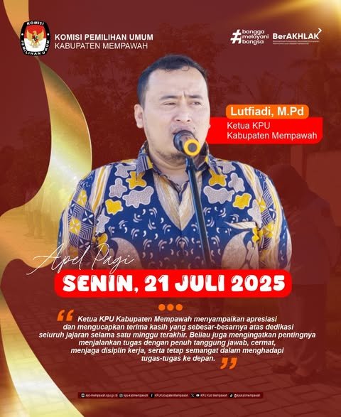 KPUMempawah-Komisi Pemilihan Umum (KPU) Kabupaten Mempawah kembali melaksanakan rutinitas Apel Pagi yang berlangsung di halaman Kantor KPU Kabupaten Mempawah, Senin (21/7/2025).
