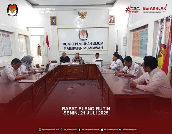 KPUMempawah-Komisi Pemilihan Umum (KPU) Kabupaten Mempawah melaksanakan Rapat Pleno Rutin pada Senin, 21 Juli 2025, yang berlangsung di Aula Kantor KPU Kabupaten Mempawah. Rapat ini dipimpin langsung oleh Ketua KPU Kabupaten Mempawah, Lutfiadi.