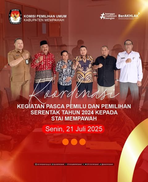 KPUMempawah-Ketua (Lutfiadi) dan Anggota KPU Kabupaten Mempawah (Muhammad Syahbandi) didampingi Kasubbag TPP dan Parhubmas Dedi Kurniawan melaksanakan koordinasi terkait dengan kegiatan pasca pemilu dan pemilihan serentak tahun 2024 ke Sekolah Tinggi Agama Islam Mempawah, Senin, 21 Juli 2025.