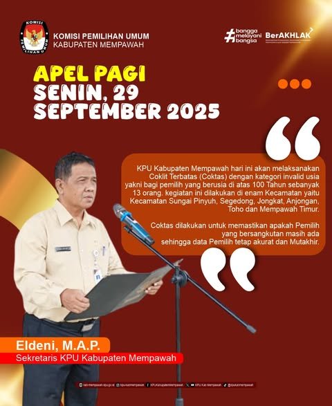 Bertindak sebagai pembina apel, Sekretaris KPU Kabupaten Mempawah, Eldeni, menyampaikan apresiasi kepada seluruh jajaran yang telah melaksanakan kewajiban mengikuti apel rutin. Disamping itu Eldeni juga menyampaikan bahwa KPU Kabupaten Mempawah akan melaksanakan agenda Coklit Terbatas (Coktas) kategori Invalid Usia, yakni bagi pemilih yang berusia di atas 100 tahun sebanyak 13 orang. Kegiatan ini akan dilakukan di enam Kecamatan.