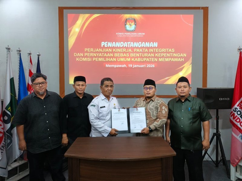 KPUMempawah-Komisi Pemilihan Umum Kabupaten Mempawah melaksanakan kegiatan penandatanganan Perjanjian Kinerja, Pakta Integritas, serta Pernyataan Bebas Benturan Kepentingan yang berlangsung di Aula KPU Mempawah, Senin (19/1/2026).