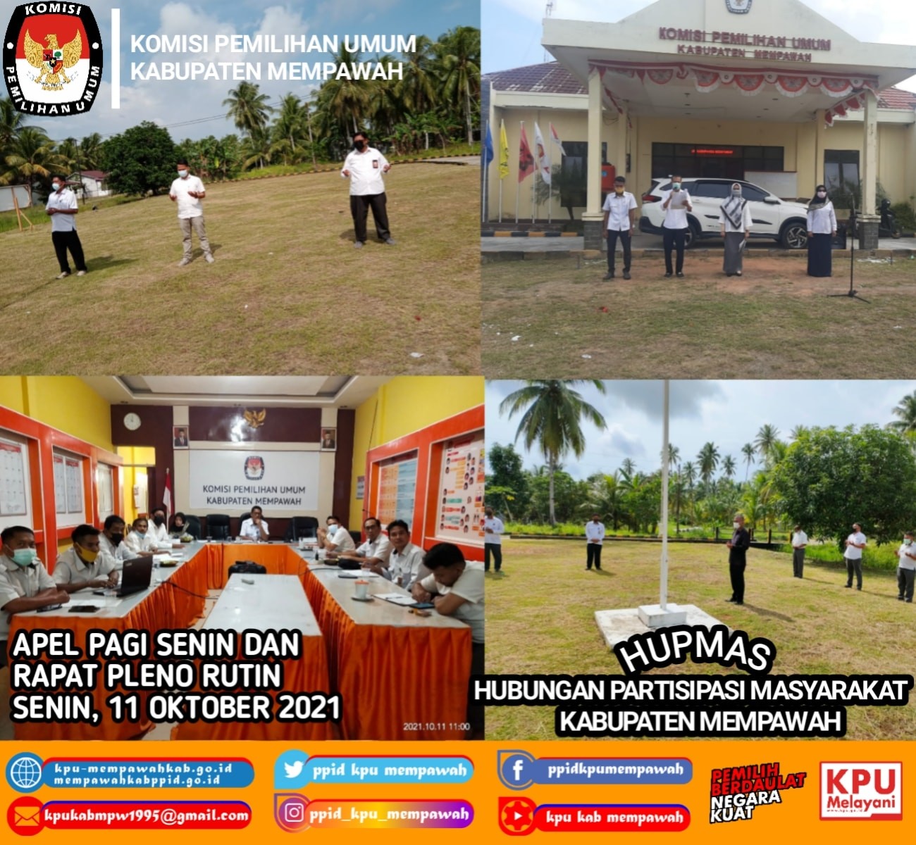 Senin, 11 Oktober 2021, Kegiatan Rutin Pelaksanaan Apel Senin dengan Pembina Apel Anggota KPU Kabupaten Mempawah Ibu Munawaroh, S.Pd.I, yang diikuti seluruh jajaran KPU Kabupaten Mempawah, kemudian dilanjutkan dengan Rapat Pleno Rutin Senin di Ruang Aula Rapat KPU Kabupaten Mempawah. Rapat dipimpin oleh Ketua KPU Kabupaten Mempawah Bapak Muhammad Agoes Soesanto, SH dan dihadiri oleh seluruh Komisioner KPU Kabupaten Mempawah, Sekretaris KPU Kabupaten Mempawah, Kasubbag dan Subbag Koordinator di lingkungan Sekretariat KPU Kabupaten Mempawah.