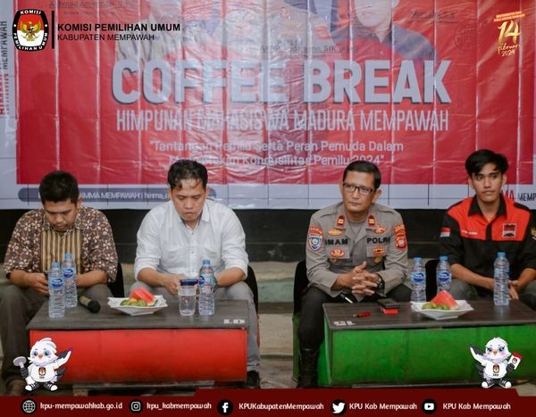 KPUMempawah-Anggota KPU Kabupaten Mempawah Bapak Mursalin, SE Menghadiri undangan Himpunan Mahasiswa Madura Mempawah (HIMMA) Kabupaten Mempawah sebagai Narasumber dalam Coffe Break tentang “Tantangan Pemilu serta Peran Pemuda dalam Menciptakan Kondusifitas Pemilu 2024” bersama IPTU Imam Widiatmoko KasatBinmas Polres Mempawah dan Bawaslu Mempawah (Akhmad Amiruddin), bertempat di Caffe Shop Bang Uung Jum'at, 16 Juni 2023.