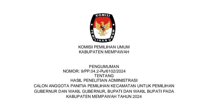 Berikut kami sampaikan Pengumuman Nomor: 9/PP.04.2-Pu/6102/2024 tentang Hasil Penelitian Administrasi Calon Anggota Panitia Pemilihan Kecamatan untuk Pemilihan Gubernur dan Wakil Gubernur, Bupati dan wakil Bupati Pada Kabupaten Mempawah Tahun 2024. Info selengkapnya silahkan unduh dokumen dibwah ini: