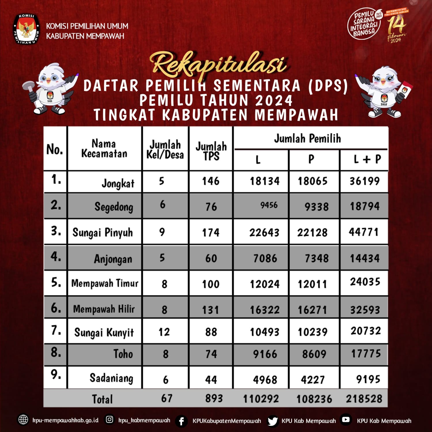 Berikut Info Grafis Rekapitulasi Daftar Pemilih Sementara (DPS) dalam Pemilu Tahun 2024 di 9 (Sembilan) Kecamatan, Kabupaten Mempawah yang ditetapkan dalam Rapat Pleno Terbuka Rekapitulasi Daftar Pemilih Hasil Pemutakhiran (DPHP) dan Penetapan Daftar Pemilih Sementara (DPS) dalam Pemilihan Umum Tahun 2024 Tingkat Kabupaten Mempawah Tanggal 5 April 2023.