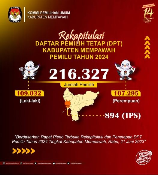 Berikut Info Grafis Rekapitulasi Daftar Pemilih Tetap (DPT) dalam Pemilu Tahun 2024 Tingkat Kabupaten Mempawah, yang ditetapkan dalam Rapat Pleno Terbuka Rekapitulasi dan Penetapan Daftar Pemilih Tetap (DPT) Tingkat Kabupaten Mempawah, Rabu, 21 Juni 2023.
