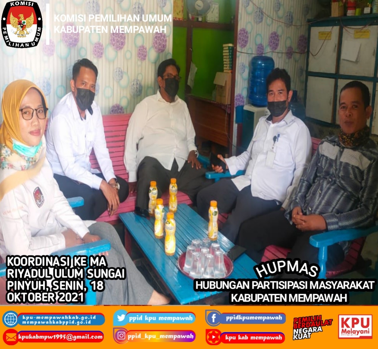 Senin, 18 Oktober 2021, Komisioner KPU Kabupaten Mempawah (Mursalin, SE.I, Rasidi, M.Pd.I, Fetrus Anyim, S.Ag, dan Munawaroh, S.Pd) melakukan silahturahmi dan Koordinasi dengan Kepala Sekolah MA. Riyadul Ulum Sungai Pinyuh (Bapak Fuad) dalam rangka Pemutakhiran Data Pemilih Berkelanjutan khususnya Pemilih Pemula yakni Informasi Data Siswa yang telah berusia 17 Tahun.