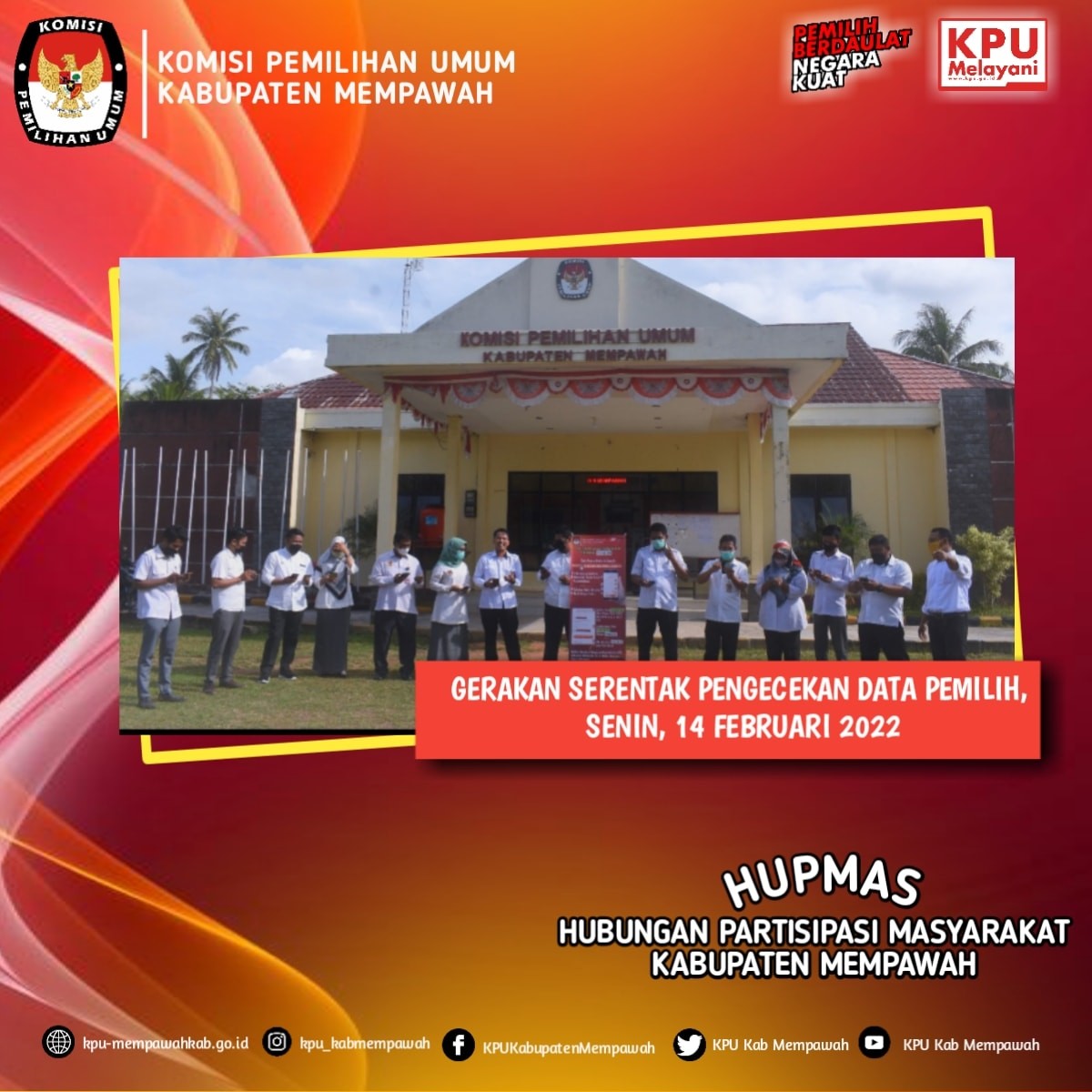 Senin, 14 Februari 2022, berdasarkan Surat Ketua KPU Provinsi Kalbar, Tanggal 8 Februari 2022, Perihal Gerakan Serentak Pengecekan Data Pemilih, seluruh Jajaran Komisi Pemilihan Umum Kabupaten Mempawah melaksanakan Gerakan Secara Serentak Pengecekan Data Pemilih melalui Link: lindungihakmu.kpu.go.id dengan menggunakan Android masing-masing.