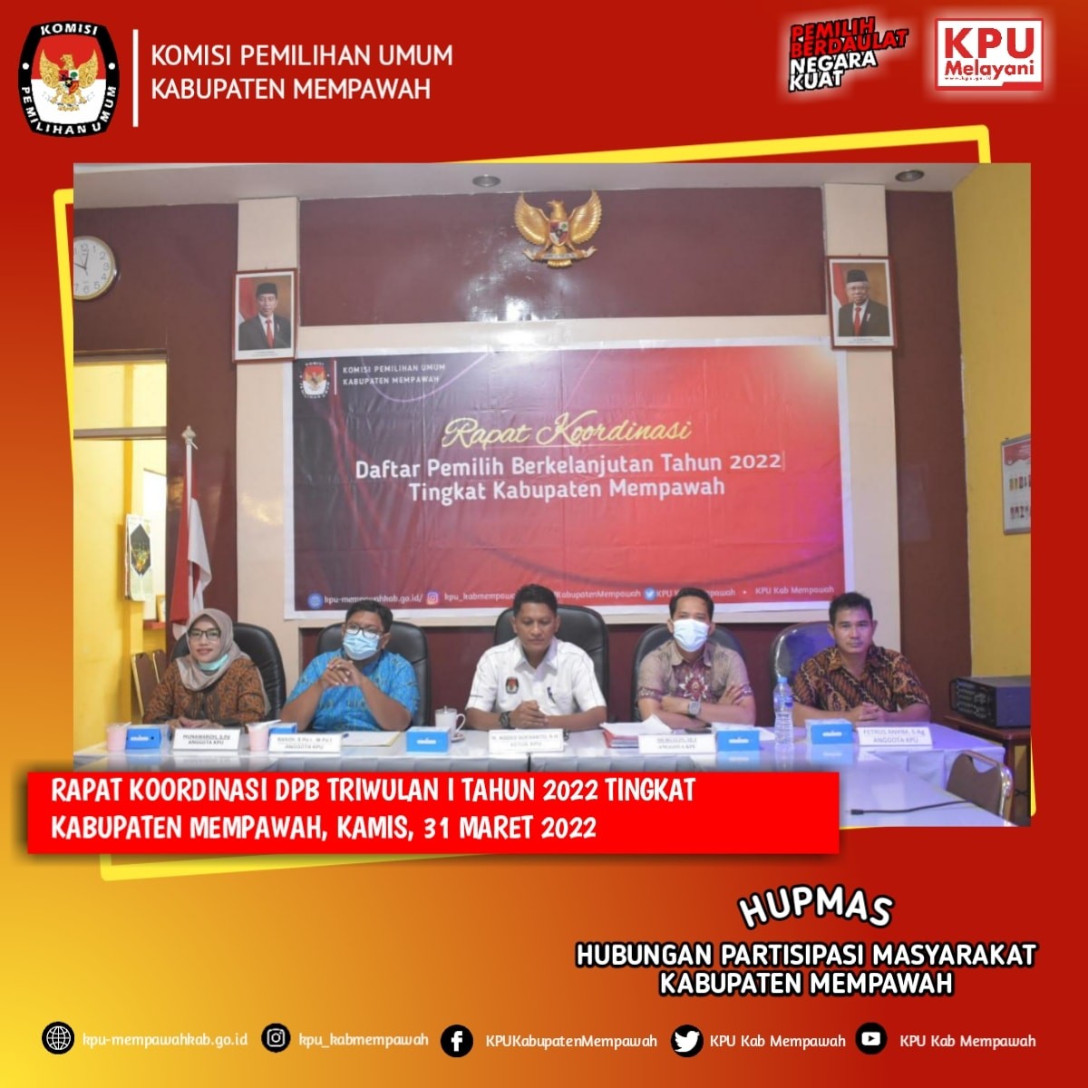 KPUMempawah – Komisi Pemilihan Umum (KPU) Kabupaten Mempawah melaksanakan Rapat Rapat Rekapitulasi Daftar Pemilih Berkelanjutan (DPB) Triwulan I tahun 2022. Rapat Tersebut dilaksanakan di aula KPU Mempawah secara daring (Zoom Metting) online Kamis, (31/03/2022).