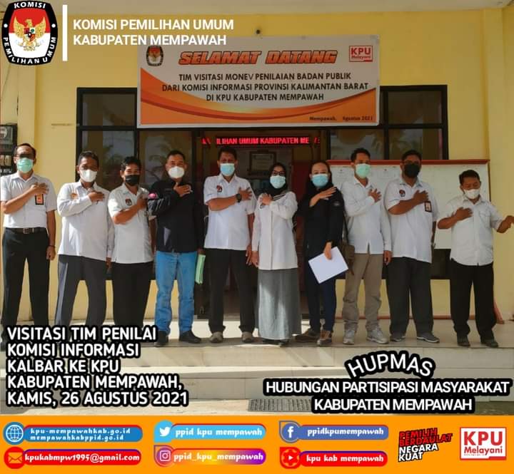 Kamis, 26 Agustus 2021, KPU Kabupaten Mempawah menerima Kunjungan Komisi Informasi Provinsi Kalimantan Barat dalam rangka Visitasi Monitoring dan Evaluasi (Monev) Penilaian Badan Publik Tahun 2021 di KPU Kabupaten Mempawah.