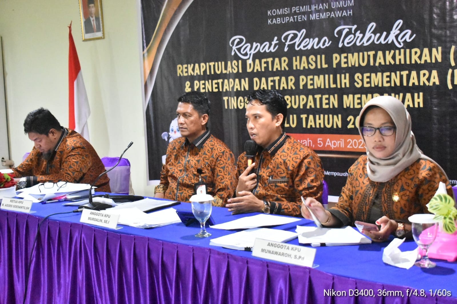KPUMempawah- Komisi Pemilihan Umum (KPU) Kabupaten Mempawah melaksanakan Rapat Pleno Terbuka Rekapitulasi Daftar Hasil Pemutakhiran (DPHP) dan Penetapan Daftar Pemilih Sementara (DPS) Tingkat Kabupaten Mempawah Pemilu Tahun 2024, bertempat di Hotel Wisata Nusantara Desa Penibung Mempawah, Rabu, 5 April 2023.