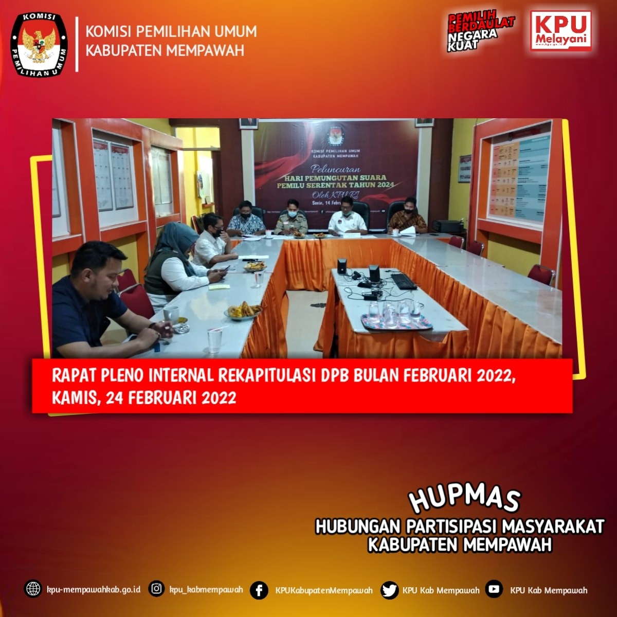 KPUMempawah– Komisi Pemilihan Umum (KPU) Kabupaten Mempawah merealisasikan rapat pleno internal terkait rekapilutasi pemutakhiran daftar pemilih berkelanjutan (DPB) periode bulan Februari Tahun 2022. Rapat tersebut dilaksanakan di aula Kantor KPU Kabupaten Mempawah pada Kamis, (24/02/2022).