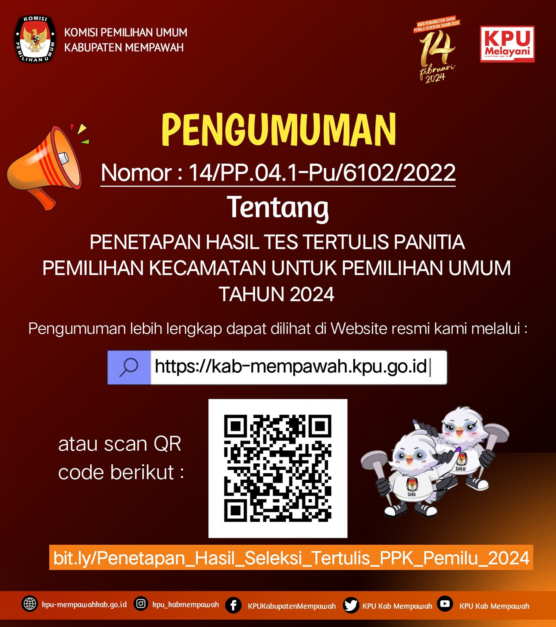 KPUMempawah – Komisi Pemilihan Umum(KPU) Kabupaten Mempawah umumkan penetapan hasil tes tertulis seleksi Panitia Pemilihan Kecamatan (PPK) untuk Pemilu Tahun 2024 dengan metode Computer Assisted Test (CAT). Diumumkan mulai hari ini tanggal 8 hingga 10 Desember 2022.