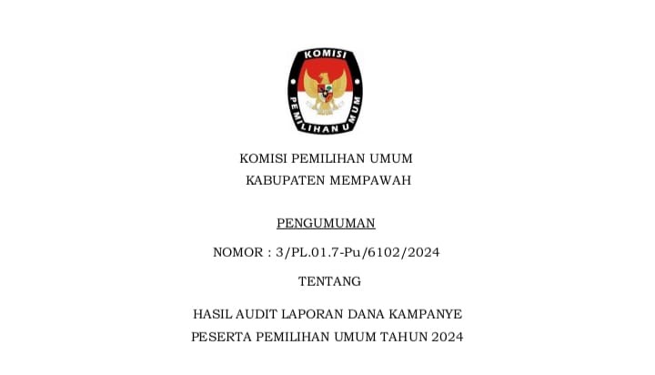 Berikut kami sampaikan Pengumuman Nomor 3/PL.01.7-Pu/6102/2024 tentang Hasil Audit Laporan Dana Kampanye Peserta Pemilu Tahun 2024, info selengkapnya ---------