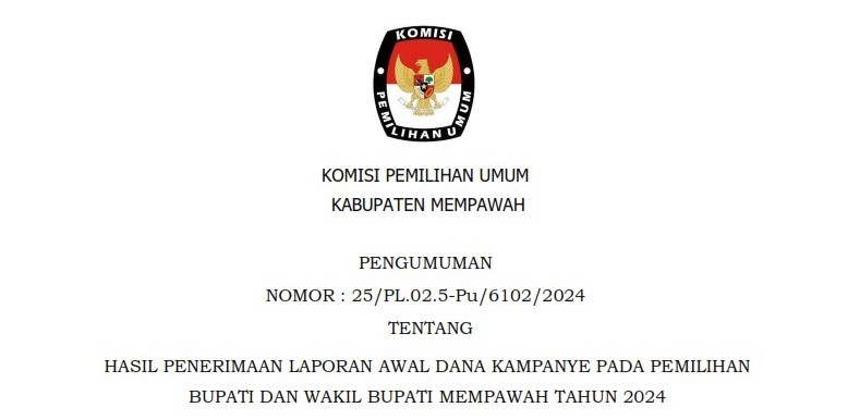 Berikut kami sampaikan Pengumuman Hasil Penerimaan Laporan Awal Dana Kampanye Pada Pemilihan Bupati dan Wakil Bupati Mempawah Tahun 2024