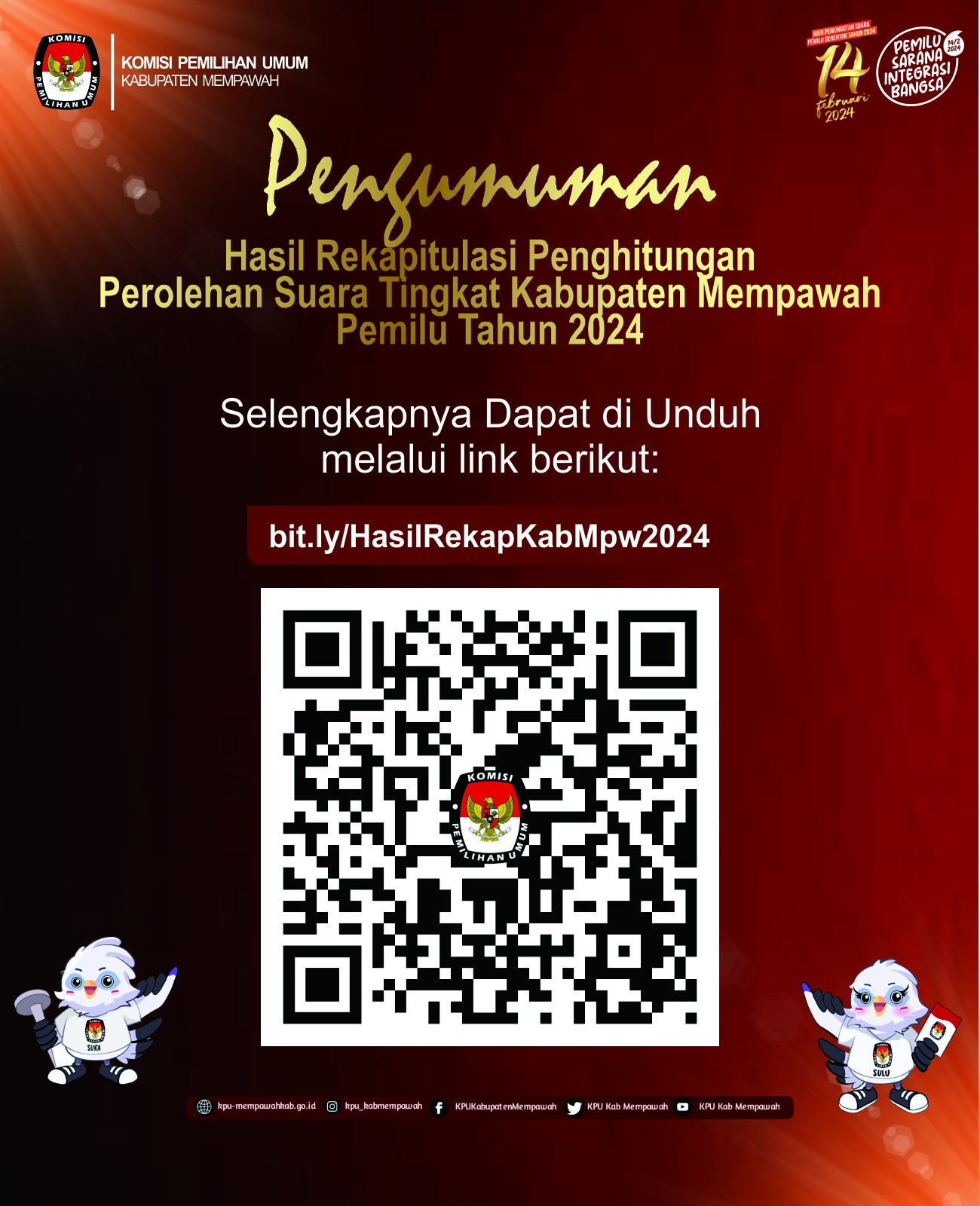 Berikut disampaikan Rekapitulasi Hasil Penghitungan Perolehan Suara TIngkat Kabupaten Mempawah Tahun 2024.