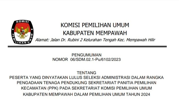 Pengumuman peserta yang dinyatakan lulus seleksi administrasi dalam rangka pengadaan Tenaga Pendukung Sekretariat Panitia Pemilihan Kecamatan (PPK) pada Sekretariat Komisi Pemilihan Umum Kabupaten Mempawah dalam Pemilihan Umum Tahun 2024