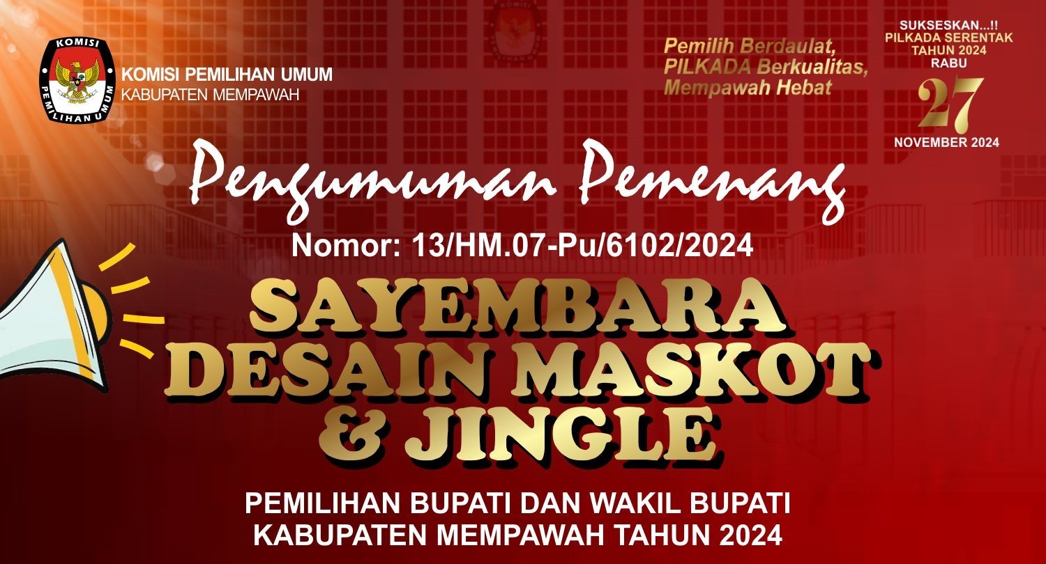 Berikut Kami sampaikan Pengumuman Nomor: 13/HM.07-Pu/6102/2024 tentang Pemenang Sayembara Maskot dan Jingle Pemilihan Bupati dan Wakil Bupati Kabupaten Mempawah Tahun 2024,