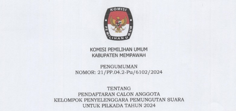 Berikut diinformasikan Pengumuman Pendaftaran Calon Anggota Kelompok Penyelenggara Pemungutan Suara untuk Pemilihan Gubernur dan Wakil Gubernur Kalimantan Barat serta Bupati dan Wakil Bupati Mempawah Tahun 2024. Informasi selengkapnya dapat di Download Dokumen dibawah ini: