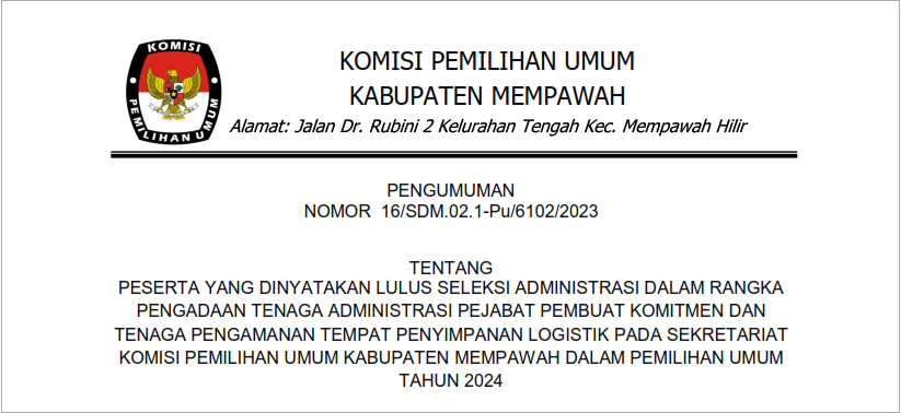 #TemanPemilih berikut diinformasikan Pengumuman Peserta yang dinyatakan Lulus Seleksi Administrasi dalam Rangka Pengadaan Tenaga Administrasi Pejabat Pembuat Komitmen dan Tenaga Pengamanan Tempat Penyimpanan Logistik pada Sekretariat Komisi Pemilihan Umum Kabupaten Mempawah dalam Pemilihan Umum Tahun 2024