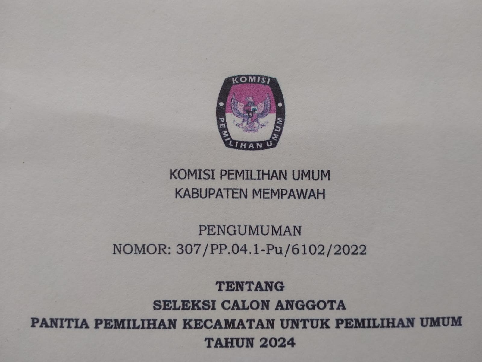 PENGUMUMAN SELEKSI CALON ANGGOTA PANITIA PEMILIHAN KECAMATAN UNTUK PEMILU TAHUN 2024