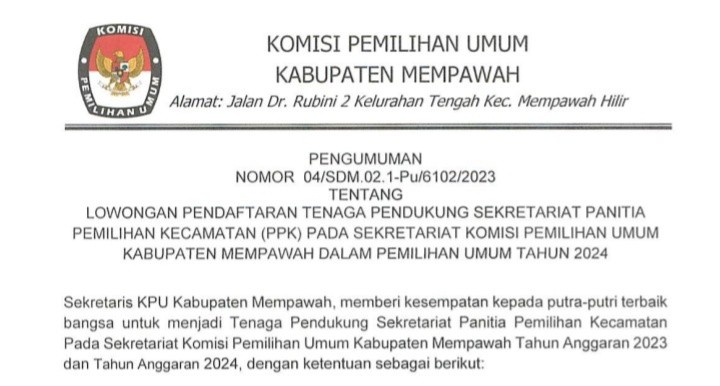 Pengumuman Tentang Pendaftaran Tenaga Pendukung Sekretariat Panitia Pemilihan Kecamatan (PPK) Pada Sekretariat Komisi Pemilihan Umum Kabupaten Mempawah dalam Pemilihan Umum Tahun 2024