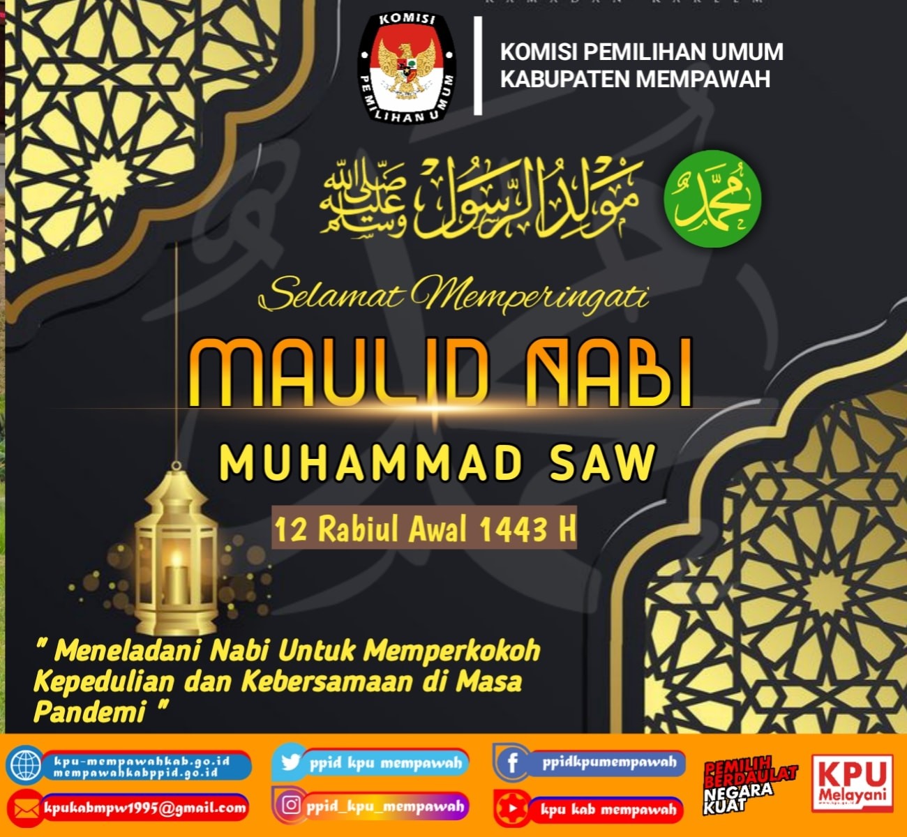 Seluruh Jajaran Komisi Pemilihan Umum Kabupaten Mempawah mengucapkan Selamat Memperingati Maulid Nabi Muhammad SAW, 12 Rabiul Awal 1443 H / 19 Oktober 2021.