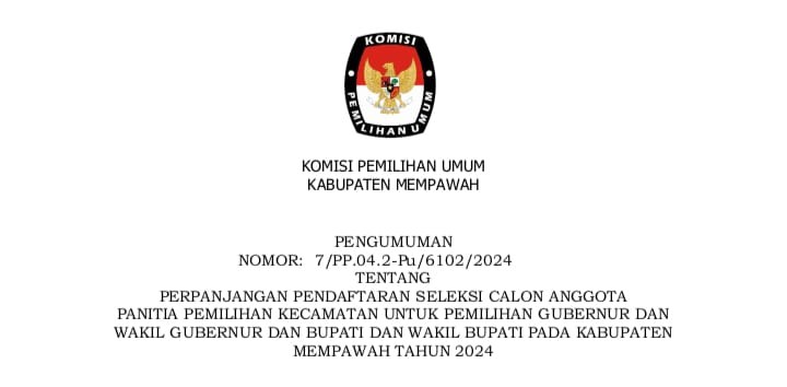 Berikut kami sampaikan Pengumuman Perpanjangan Pendaftaran Seleksi Calon Anggota PPK Untuk Pemilihan Gubernur dan Wakil Gubernur, Bupati dan Wakil Bupati Kabupaten Mempawah Tahun 2024, info selengkapnya silahkan lihat dokumen di bawah ini: