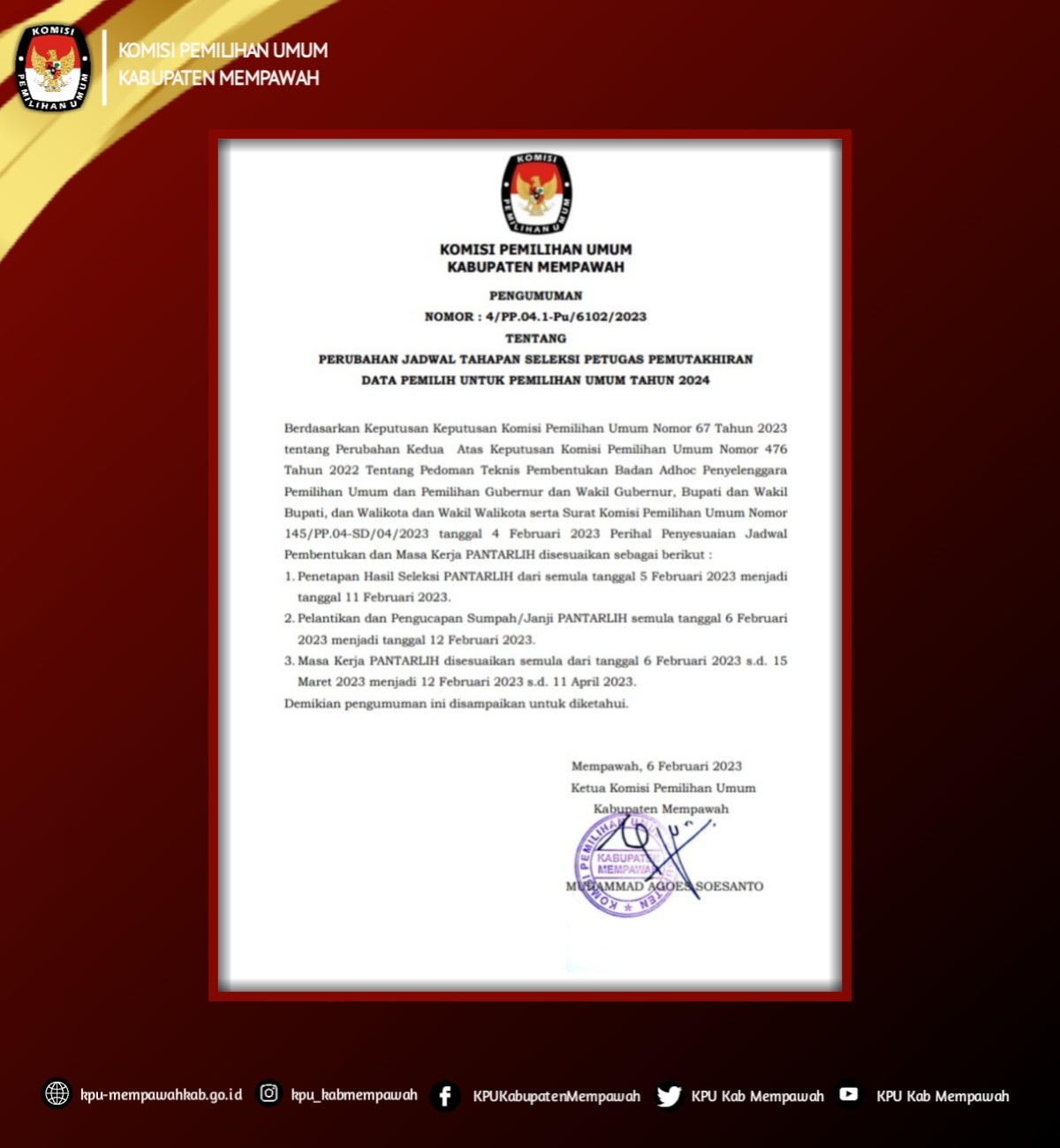 #Teman Pemilih berikut kami sampaikan info perubahan Jadwal Seleksi Pantarlih Pemilu Tahun 2024, untuk info selengkapnya silahkan ke Kantor KPU Kabupaten Mempawah Jln. Dr Rubini 2 Kelurahan Tengah Kecamatan Mempawah Hilir.