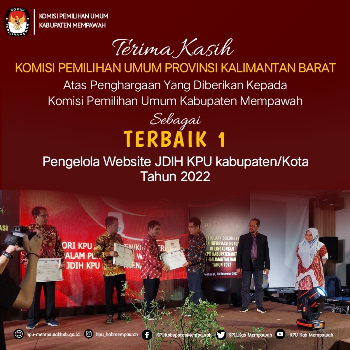 Terbaik 1 diraih KPU Kabupaten Mempawah dalam Pengelolaan Website JDIH pada acara Penghargaan Pengelolaan Jaringan Dokumentasi dan Informasi Hukum KPU Kabupaten/Kota yang diselenggarakan KPU Provinsi Kalimantan Barat Sabtu, 10 Desember 2022 di Hotel Orchardz Gajahmada Pontianak, Mempawah, 11/12/2022.