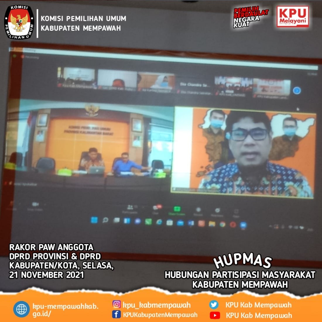 Selasa, 21 Desember 2021, KPU Kabupaten Mempawah mengikuti Undangan KPU Provinsi Kalimantan Barat secara Daring, Rapat Koordinasi Penggantian Antarwaktu Anggota DPRD Provinsi dan DPRD Kabupaten/Kota.