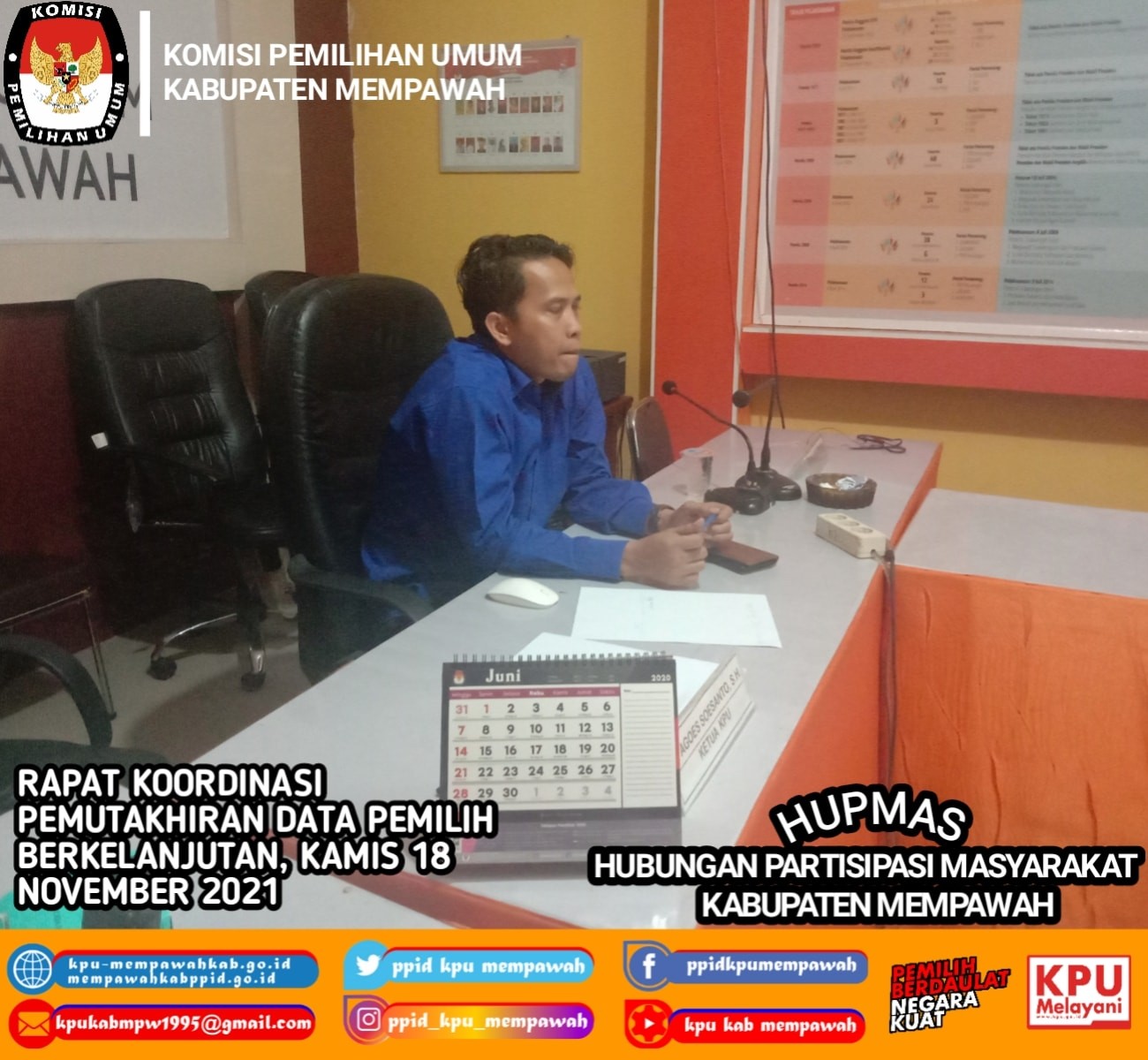 Kamis, 18 November 2021, KPU Kabupaten Mempawah Mengikuti undangan KPU Provinsi secara DARING dalam rangka RAPAT KOORDINASI PEMUTAKHIRAN DATA PEMILIH BERKELANJUTAN Terkait dengan migrasi data pemilih berkelajutan tahun 2020 dan 2021 kedalam Sistem Data Pemilih (SIDALIH).
