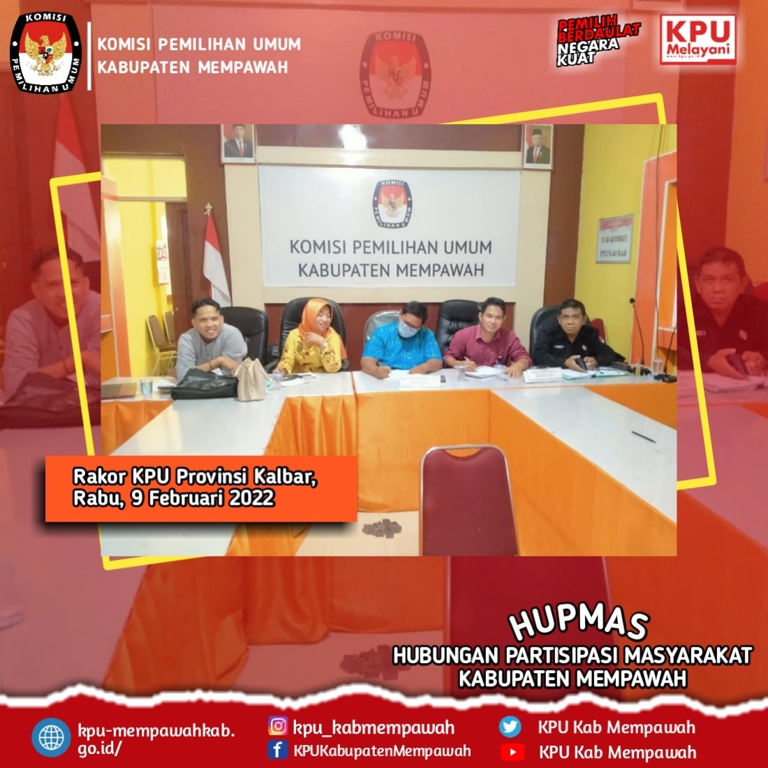 Rabu, 9 Februari 2022, Ketua, Anggota, dan Sekretaris Komisi Pemilihan Umum (KPU) Kabupaten Mempawah mengikuti Undangan KPU Provinsi Kalimantan Barat secara Daring, yakni Rapat Koordinasi Persiapan Pencanangan Pembangunan Zona Integritas di Lingkungan KPU Kabupaten/Kota se-Kalimantan Barat Tahun 2022.