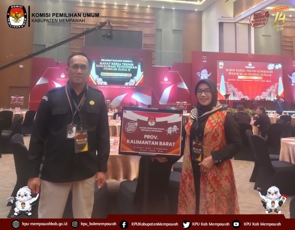 KPUMempawah-Anggota Komisi Pemilihan Umum (KPU) Kabupaten Mempawah Ibu Munawaroh, S.Pd beserta Kasubbag Teknis TPP dan Parhupmas Sekretariat KPU Kabupaten Mempawah Bapak Dedi Kurniawan, SE, Mengikuti kegiatan Rapat Kerja Teknis Sosialisasi dan Pendidikan Pemilih Zona II, di Makassar, Rabu (26/7/2023).