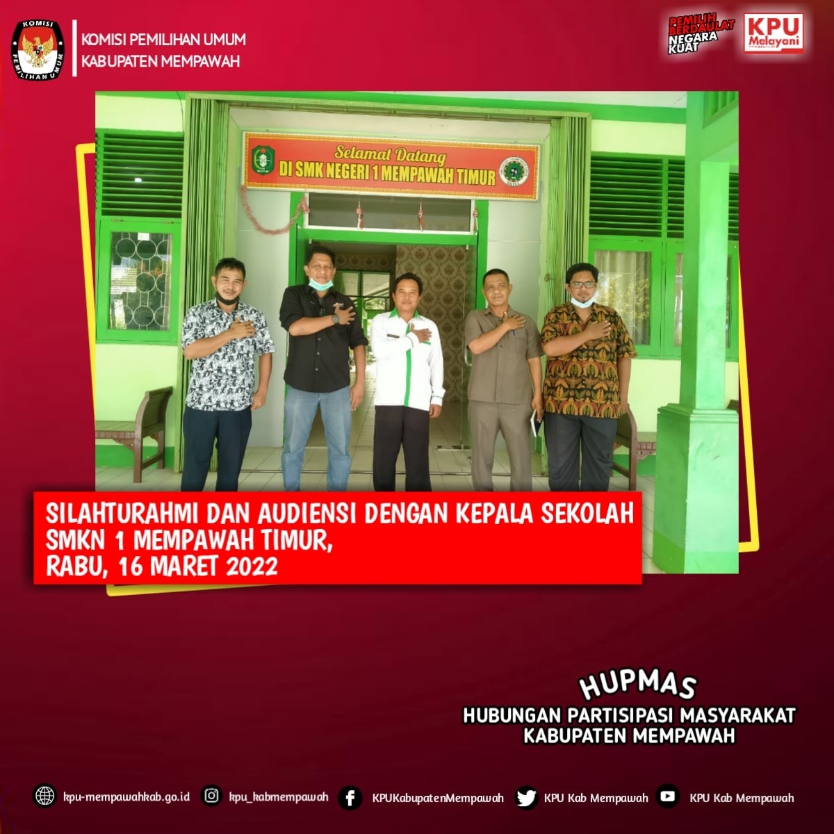 KPUMempawah - KPU Kabupaten Mempawah melakukan silaturahmi dan Koordinasi dengan Kepala Sekolah SMKN I Mempawah Timur, Bapak Soni Miftahudin, dalam rangka Pemutakhiran Data Pemilih Berkelanjutan khususnya Pemilih Pemula yakni Siswa-siswa SMKN 1 Mempawah Timur yang telah berusia 17 tahun atau lebih, dan dalam rangka menjalin kerjasama untuk Sosialisasi Pendidikan Pemilih Pemula di lingkungan SMKN I Mempawah Timur, Rabu, (16/03/2022).