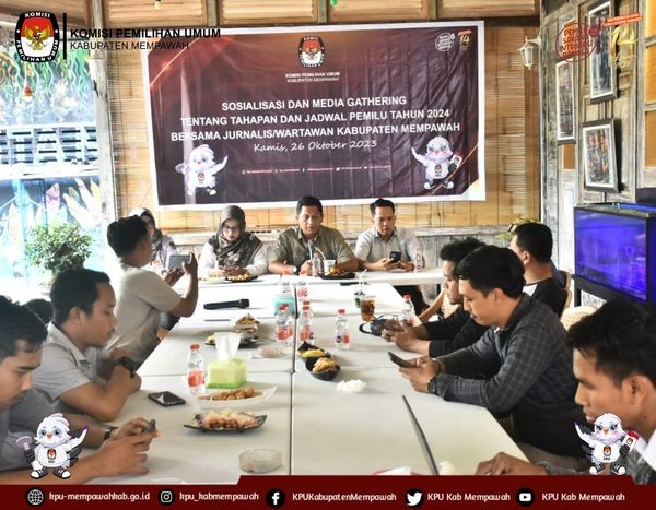 KPUMempawah-Komisi Pemilihan Umum (KPU) Kabupaten Mempawah melaksanakan Sosialisasi dan Media Gathering tentang Tahapan dan Jadwal Pemilu Tahun 2024 yang sedang berjalan dan Tahapan yang akan datang dengan Jurnalis/Wartawan Kabupaten Mempawah, bertempat di Cafe K@tamb Mempawah. Kamis (26/10/2023).