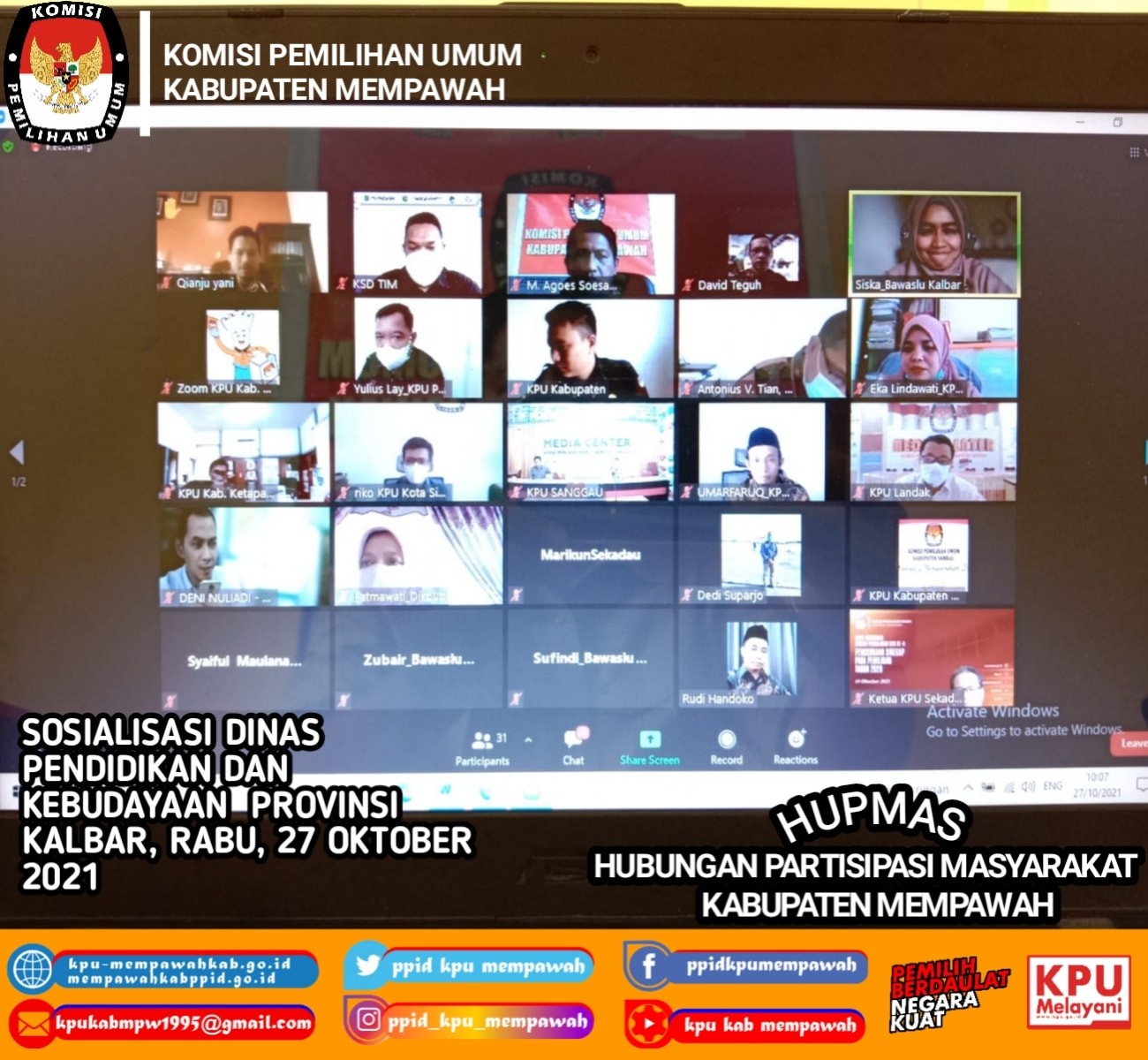 Rabu, 27 Oktober 2021, Ketua KPU Kabupaten Mempawah, Bapak Muhammad Agoes Soesanto mengikuti Undangan Sosialisasi dari Dinas Pendidikan dan Kebudayaan Provinsi Kalimantan Barat yang dilaksanakan secara Daring, dengan undangan seluruh KPU Kabupaten/Kota se-Kalbar.