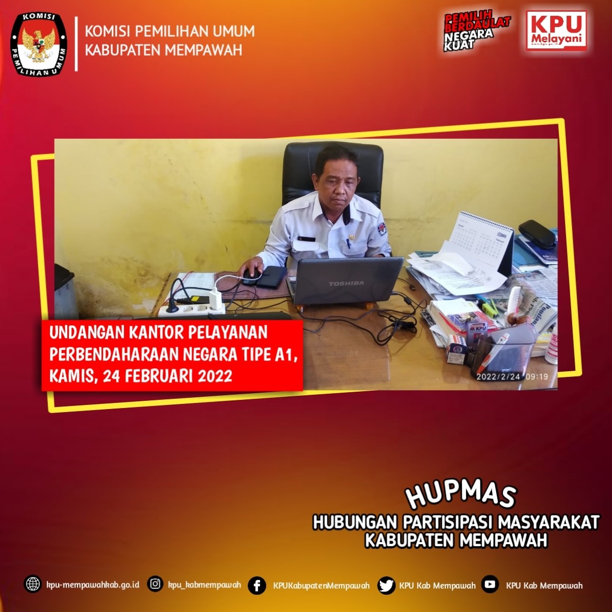 KPU Mempawah- Sekretaris KPU Kabupaten Mempawah, Bapak Eldeni, M.AP selaku KPA, mengikuti Undangan Kantor Pelayanan Perbendaharaan Negara Tipe A1 Pontianak secara Daring, (Kamis, 24/02/2022).