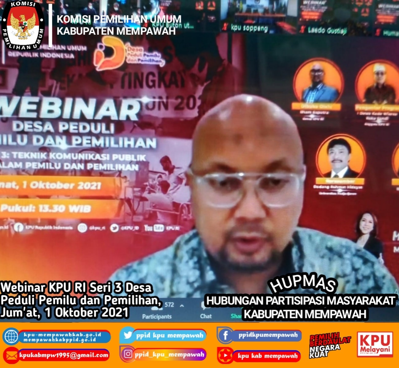 Jumat, 1 Oktober 2021, KPU Kabupaten Mempawah mengikuti Undangan KPU RI secara Daring yakni Webinar Desa Peduli Pemilu dan Pemilihan Seri 3 dengan tema "Teknik Komunikasi Publik Dalam Pemilu dan Pemilihan".